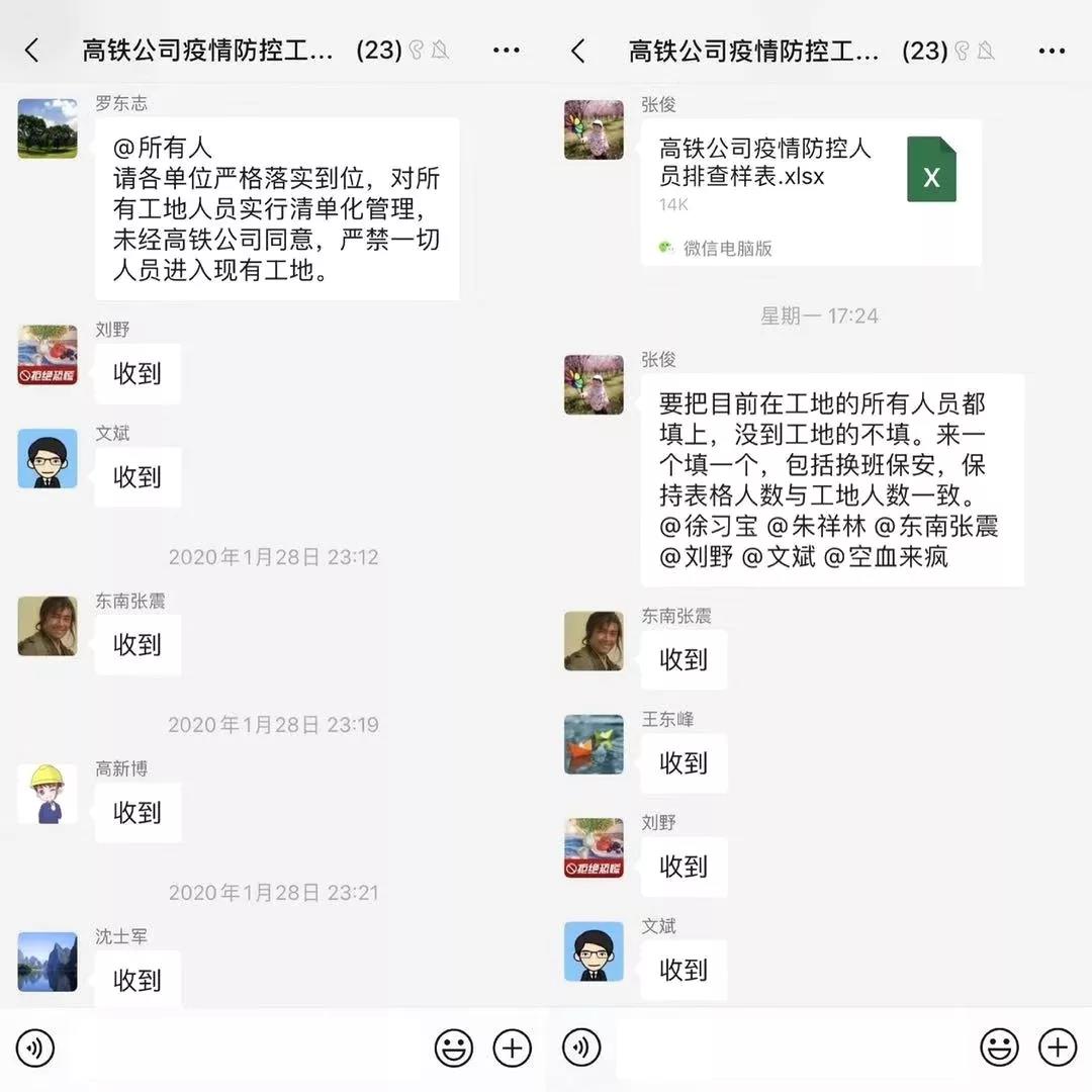 1月28日,根據(jù)集團(tuán)黨委統(tǒng)一部署,高鐵公司黨支部第一時(shí)間成立疫情防控工作聯(lián)絡(luò)組,將3個(gè)項(xiàng)目的3名項(xiàng)目經(jīng)理和聯(lián)絡(luò)員拉入微信群,下發(fā)“疫情防控返程人員信息、體溫測(cè)量統(tǒng)計(jì)表”和“疫情防控信息統(tǒng)計(jì)日?qǐng)?bào)表”,堅(jiān)持每日一群一表一報(bào)機(jī)制,專(zhuān)設(shè)來(lái)宿人員登記臺(tái),對(duì)每一位進(jìn)入項(xiàng)目部的人員進(jìn)行體溫測(cè)量、信息登記,加強(qiáng)站點(diǎn)安全防控,防止疫情輸入、蔓延、輸出,控制疾病傳播,牢牢把住第一道安全防線。