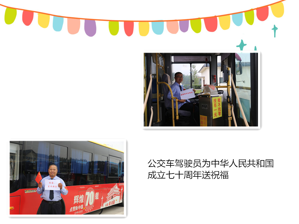 公交公司在單位門前擺設(shè)慶祝花壇,在辦公樓和場站懸掛國旗、燈籠、慶祝橫幅等,并通過電子站牌和公交車上的LED顯示屏滾動播出“熱烈慶祝中華人民共和國成立70周年”等宣傳標(biāo)語,在公交車車身及候車亭張貼宣傳畫,積極營造國慶節(jié)喜慶、歡樂、祥和的氛圍。