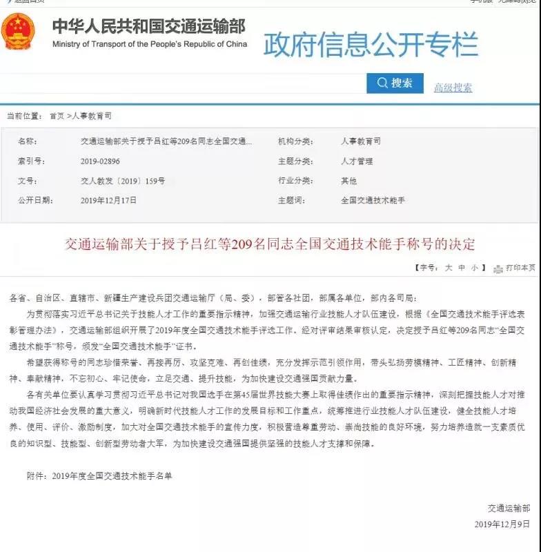 據(jù)了解,“全國(guó)交通技術(shù)能手”每?jī)赡暝u(píng)選一次,是交通運(yùn)輸行業(yè)高技能人才的最高榮譽(yù)。劉雙成獲此殊榮,對(duì)公司培育和傳承“工匠精神”,引導(dǎo)公司員工鉆研技術(shù)業(yè)務(wù),加快推進(jìn)高技能人才隊(duì)伍建設(shè)具有積極促進(jìn)作用。