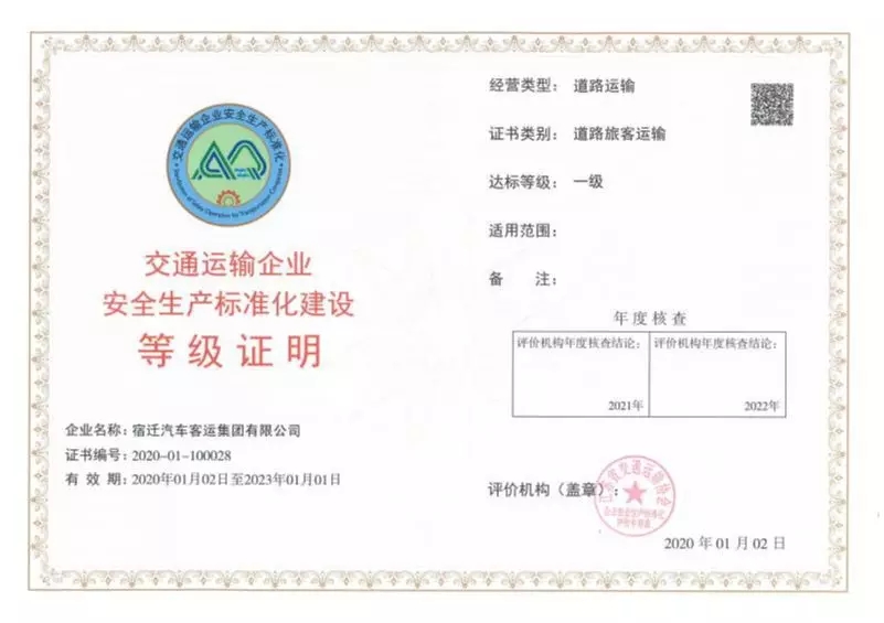 2016年啟動(dòng)安全生產(chǎn)標(biāo)準(zhǔn)化達(dá)標(biāo)認(rèn)證工作以來,宿汽集團(tuán)高度重視,宿汽公司將安全生產(chǎn)標(biāo)準(zhǔn)化工作作為安全生產(chǎn)精細(xì)化管理工作的重點(diǎn)之一,嚴(yán)格按照交通運(yùn)輸企業(yè)安全生產(chǎn)標(biāo)準(zhǔn)化達(dá)標(biāo)企業(yè)標(biāo)準(zhǔn),認(rèn)真落實(shí)和開展目標(biāo)職責(zé)、制度化管理、教育培訓(xùn)、職業(yè)健康、現(xiàn)場管理、安全投入、安全風(fēng)險(xiǎn)管控及隱患排查、應(yīng)急管理、事故處理、績效考核等工作,并持續(xù)細(xì)化和改進(jìn)工作,大力推進(jìn)企業(yè)安全生產(chǎn)標(biāo)準(zhǔn)化建設(shè),于2020年1月被評定為交通運(yùn)輸企業(yè)安全生產(chǎn)標(biāo)準(zhǔn)化一級資質(zhì)企業(yè)。