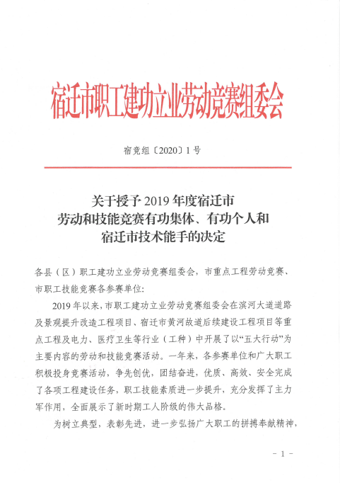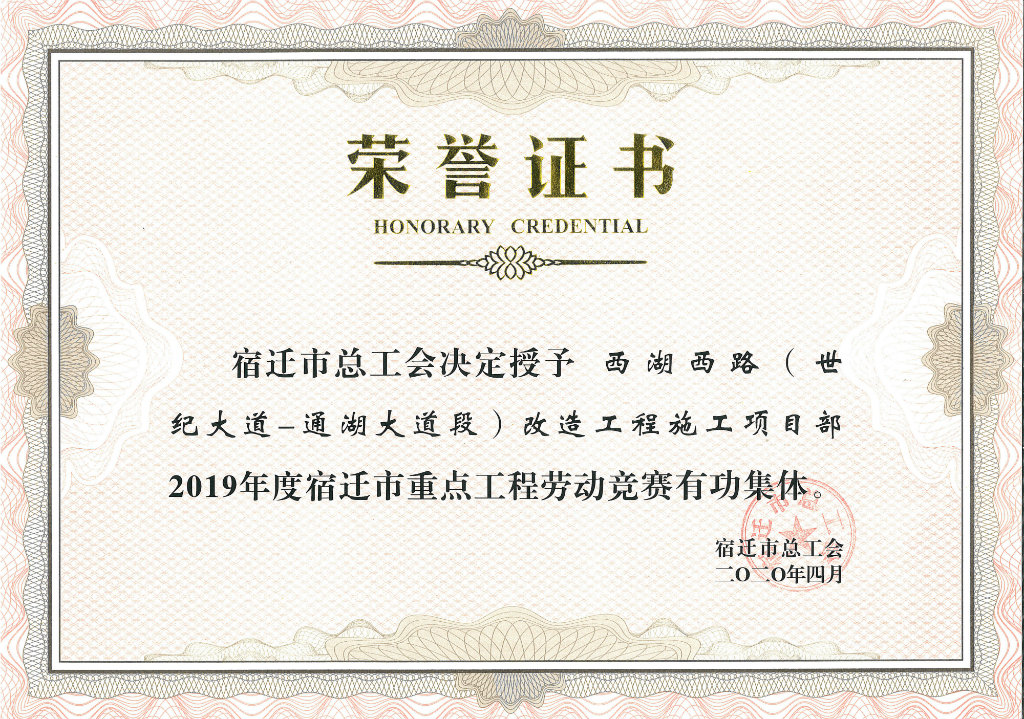 日前,宿遷市職工建功立業(yè)勞動(dòng)競(jìng)賽組委會(huì)發(fā)布《關(guān)于授予2019年度宿遷市勞動(dòng)和技能競(jìng)賽有功集體、有功個(gè)人和宿遷市技術(shù)能手的決定》,宿遷交建西湖西路(世紀(jì)大道—通湖大道段)改造工程施工項(xiàng)目部榮獲“市重點(diǎn)工程勞動(dòng)競(jìng)賽有功集體”稱號(hào),項(xiàng)目經(jīng)理魯亞明榮獲“市重點(diǎn)工程勞動(dòng)競(jìng)賽有功個(gè)人”稱號(hào)。