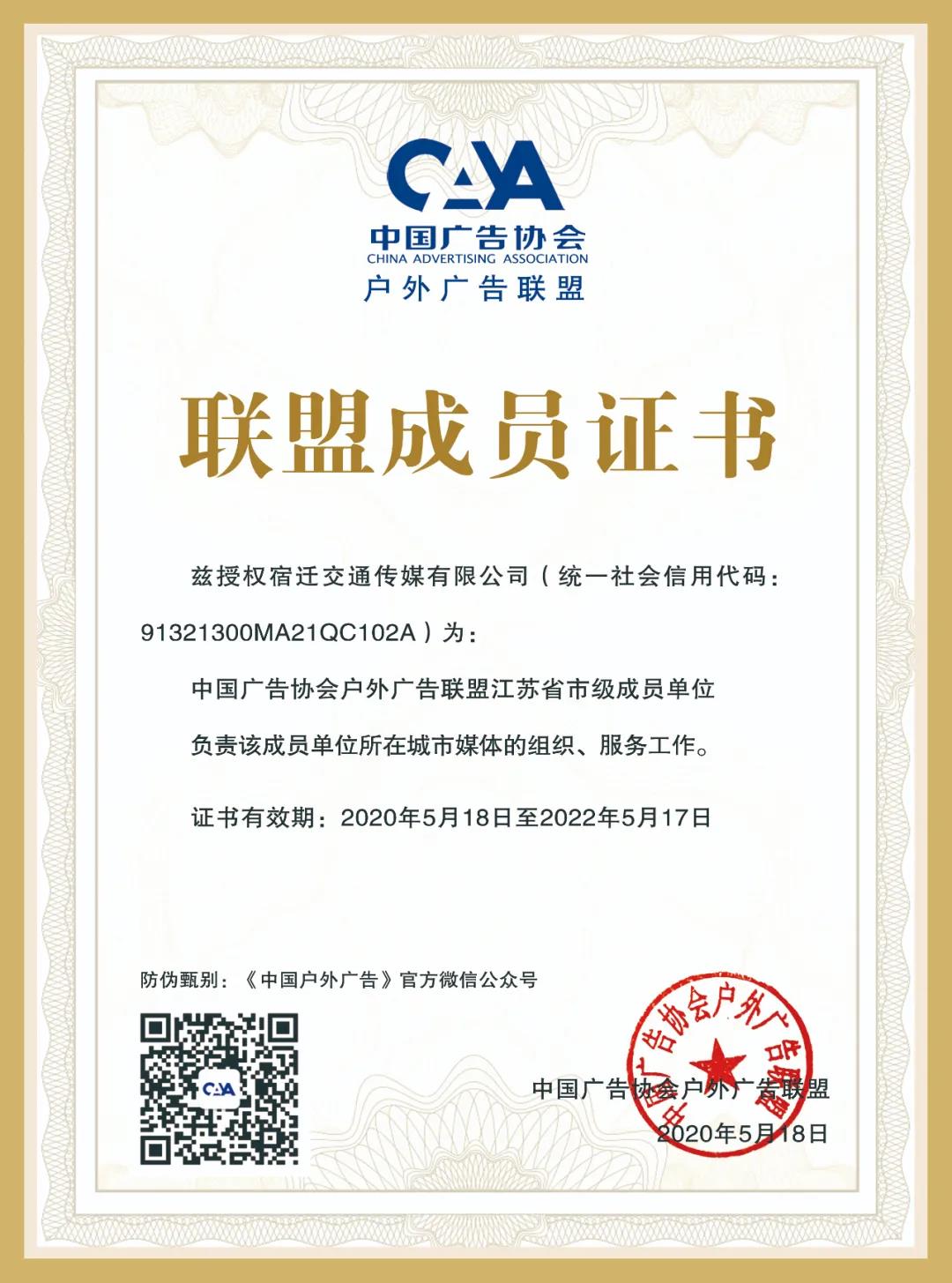 近日,宿遷交通傳媒有限公司作為宿遷首家國有企業(yè)傳媒公司成為中國廣告協(xié)會戶外廣告聯(lián)盟成員單位,負責宿遷區(qū)域各類廣告媒體資源的集結、客戶資源的分配以及媒體的組織、服務工作。