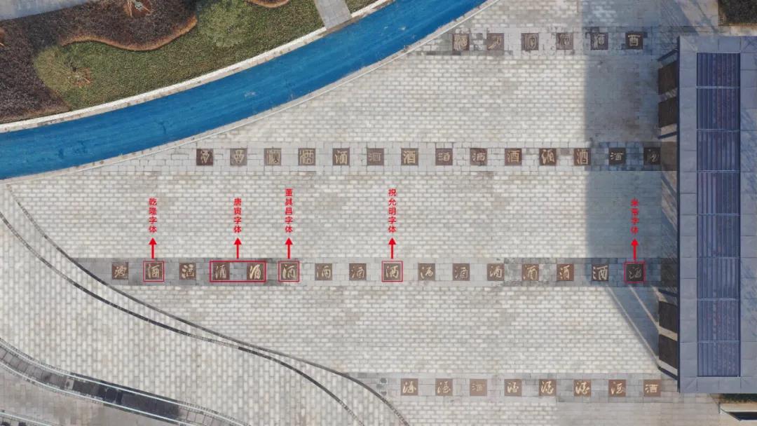 玖酒飄香浮雕整體采用99個“酒”字為設(shè)計元素,以純銅打造的“酒”字鑲嵌在深色的帶狀石材中,一條條深色的石帶如同宿遷千年運(yùn)河之水,承載著繁盛的宿遷釀酒業(yè)。用最具代表的篆書、隸書、魏碑、行書、草書等字體撰寫,并嵌入地下,呈現(xiàn)出宿遷酒都“得天地靈氣之無窮,承千年歷史之芬芳”的獨(dú)特內(nèi)涵。