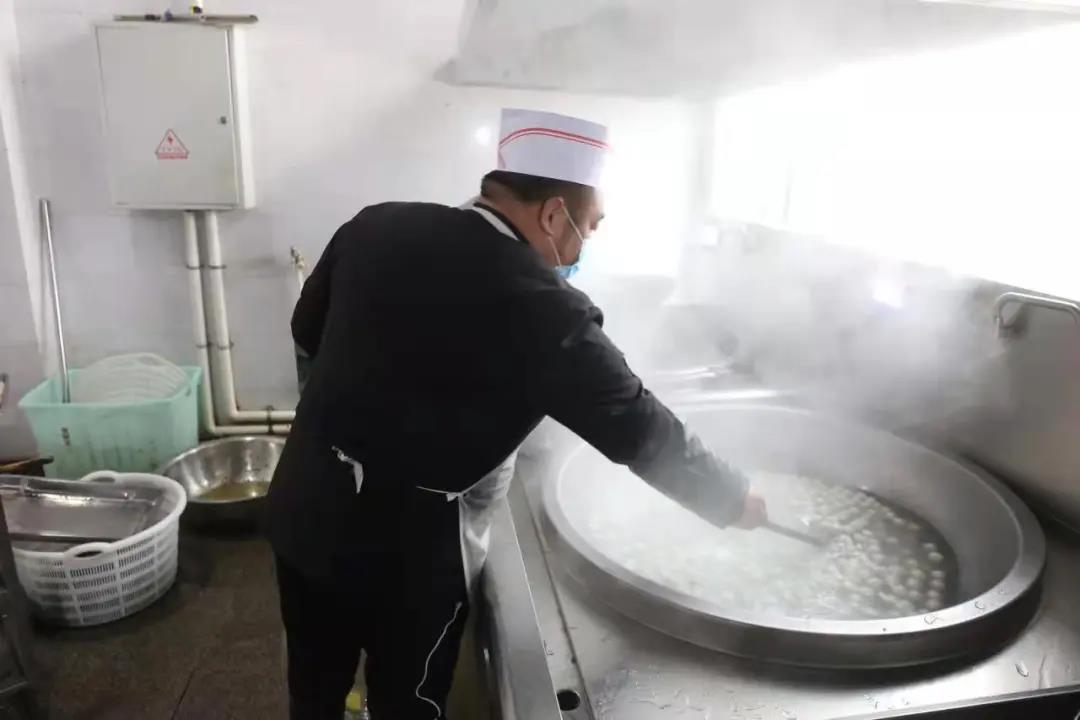 “今天是元宵節(jié),我煮了黑芝麻、花生、香芋餡料的湯圓,大家多吃點,就像在自己家里一樣”。午飯時分,廚師長陳啟東熱情地給大家盛湯圓。不一會兒功夫,滿滿兩大鍋的湯圓連湯帶水全部見底。
