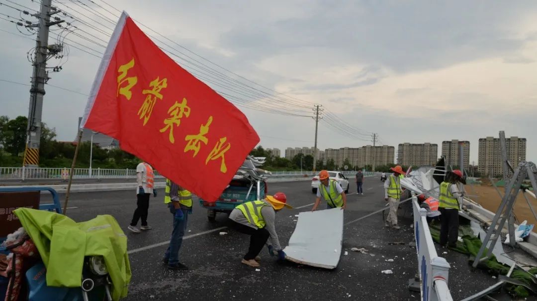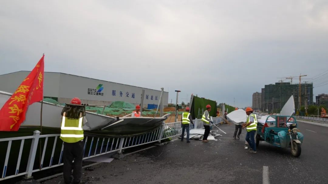 在狂風(fēng)和暴雨的雙重襲擊下,現(xiàn)場的圍擋出現(xiàn)了部分倒伏損毀的情況,面對現(xiàn)場的情況,宿遷交建工程項(xiàng)目黨支部迅速組織“紅箭突擊隊(duì)”第一時(shí)間趕往現(xiàn)場,全體黨員顧不上圍擋上鋒利的邊角和突出的螺釘,抓緊時(shí)間對損壞處進(jìn)行清理和維護(hù),及時(shí)消除道路安全隱患,確?,F(xiàn)場道路交通通暢。
