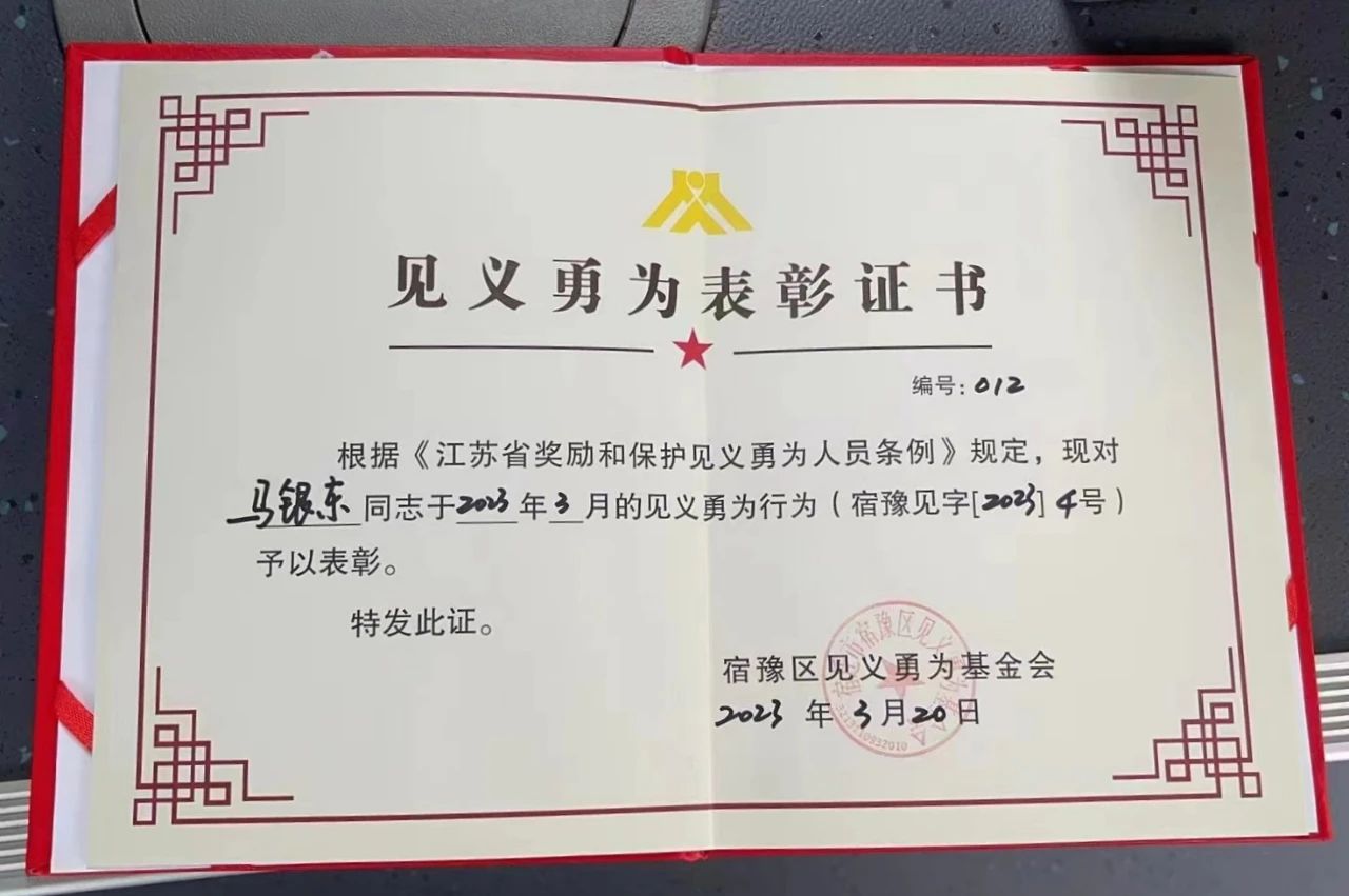 為肯定馬銀東為此次救援作出的貢獻,大力弘揚見義勇為精神,宿豫區(qū)見義勇為基金會邀請馬銀東參加見義勇為頒獎典禮,并為其頒發(fā)“見義勇為”表彰證書。