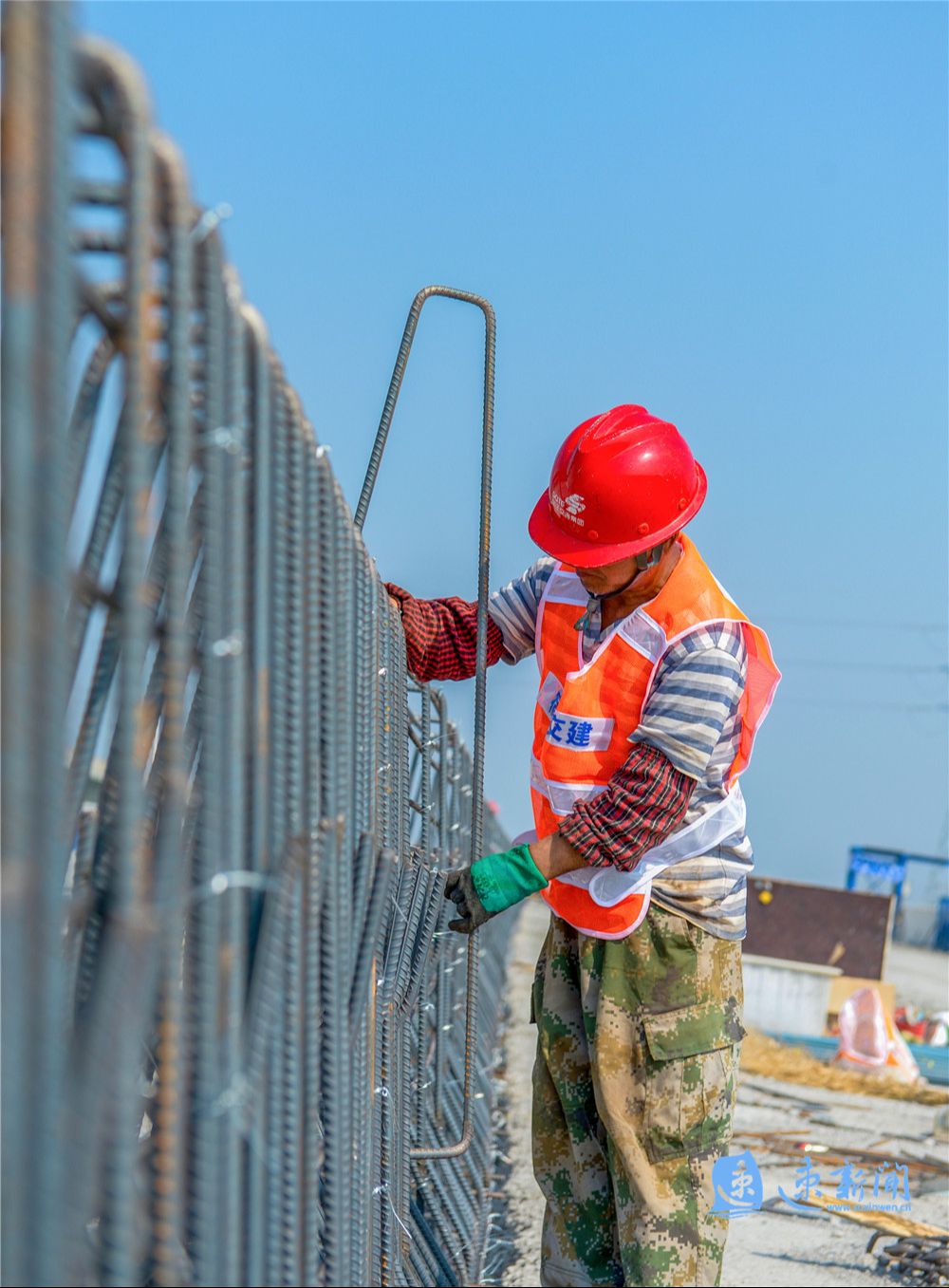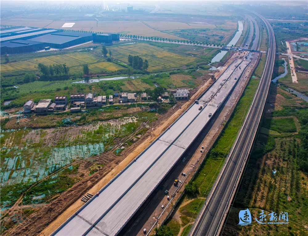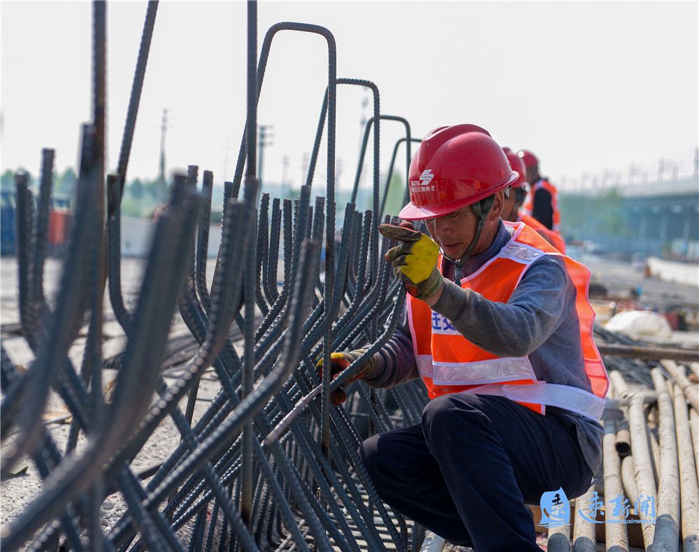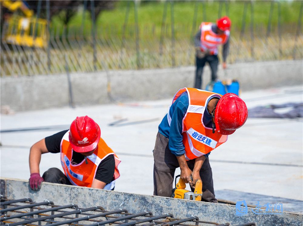 5月23日,在宿遷市港城路上跨鐵路專用線橋梁工程建設(shè)現(xiàn)場,工人正在緊張施工,一派熱火朝天的景象。