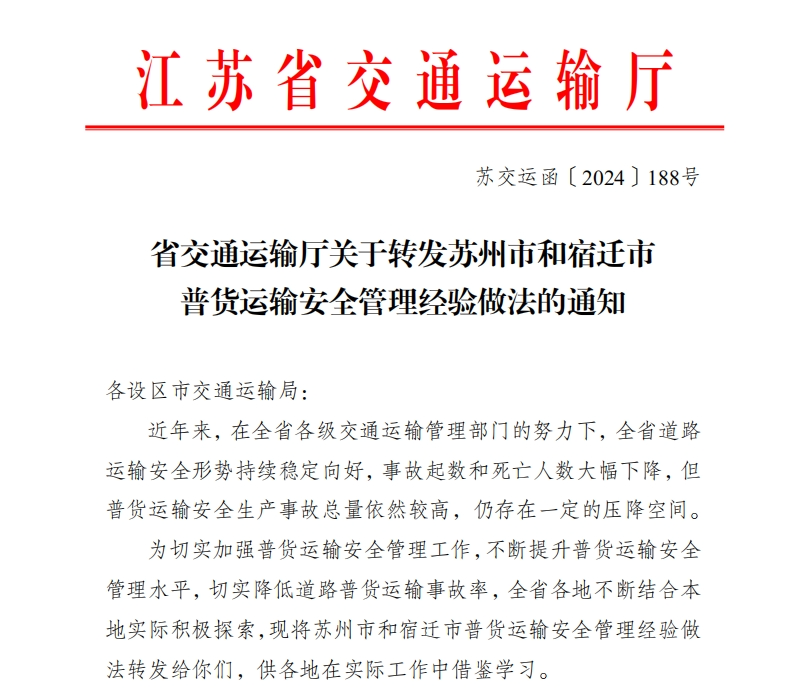 為切實加強普貨運輸安全管理工作,不斷提升普貨運輸安全管理水平,切實降低道路普貨運輸事故率,近日,省交通運輸廳將通湖物流園普貨運輸安全管理經(jīng)驗做法在全省范圍內(nèi)發(fā)文推廣,供各地在實際工作中借鑒學(xué)習(xí)。