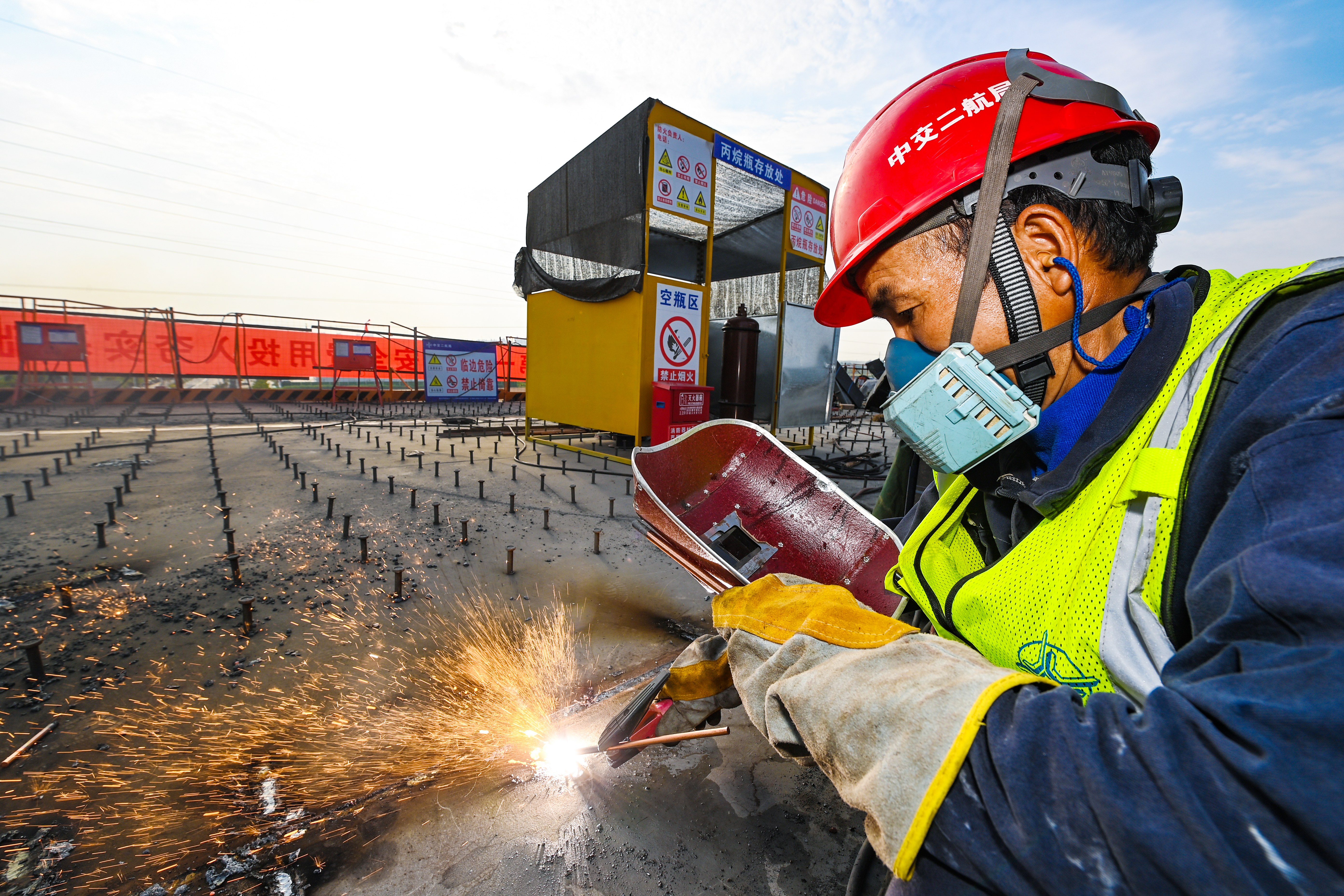 酒都路快速化改造工程施工2標段鋼結構焊接工作的一線工人吳小敏左手拿著面罩,右手拿著電焊槍,隨著“吱吱”的聲音響起,現(xiàn)場火花飛濺。汗水順著安全帽檐緩慢滴落,他早已習以為常,甩一甩頭,繼續(xù)作業(yè)。