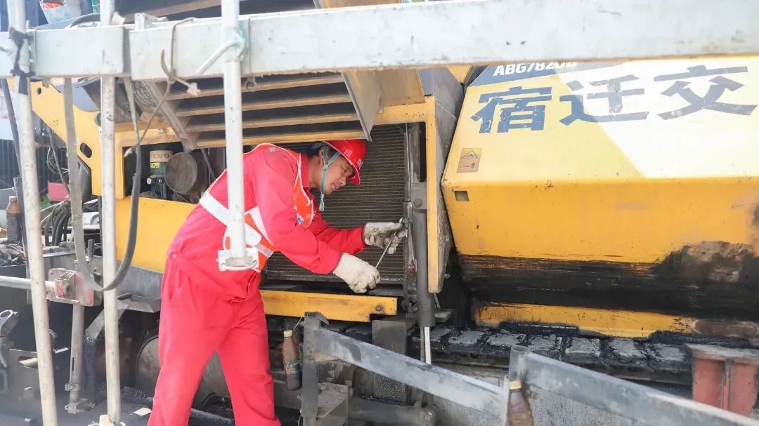 在S267省道泗陽段項目現(xiàn)場,瀝青攤鋪機找平油缸內漏,機械操作手進行緊急處理,更換密封件,確?,F(xiàn)場施工進度按期完成。