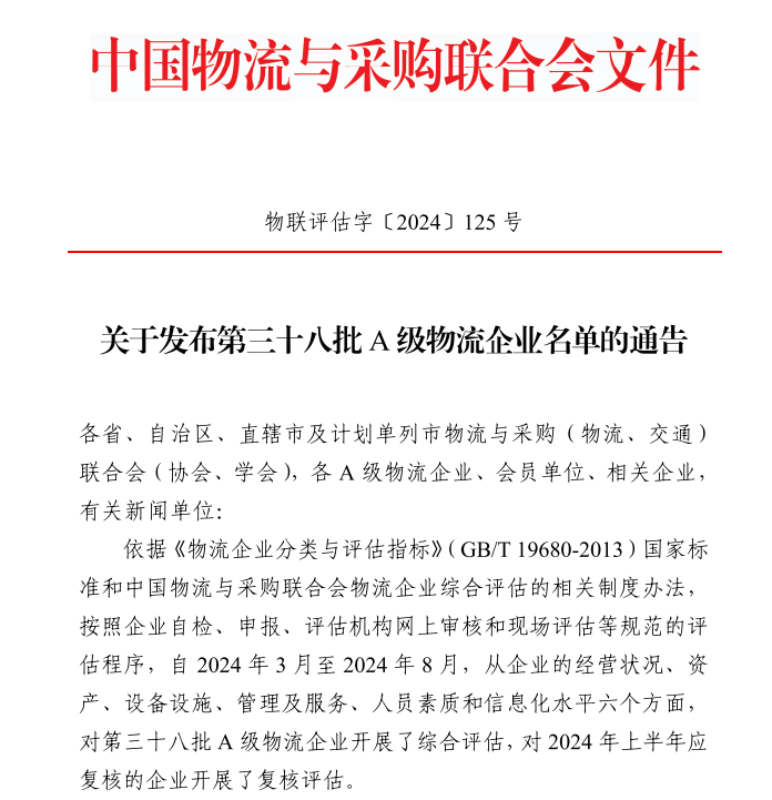 近日,中國物流與采購聯(lián)合會發(fā)布了全國第三十八批A級物流企業(yè)名單,通湖物流園憑借優(yōu)異的綜合實力和服務(wù)水平,成功在兩年的時間里從全國3A級物流企業(yè)躋身全國4A級物流企業(yè)的行列,也是該批次宿遷市唯一一家獲得該項資質(zhì)認定的物流企業(yè)。