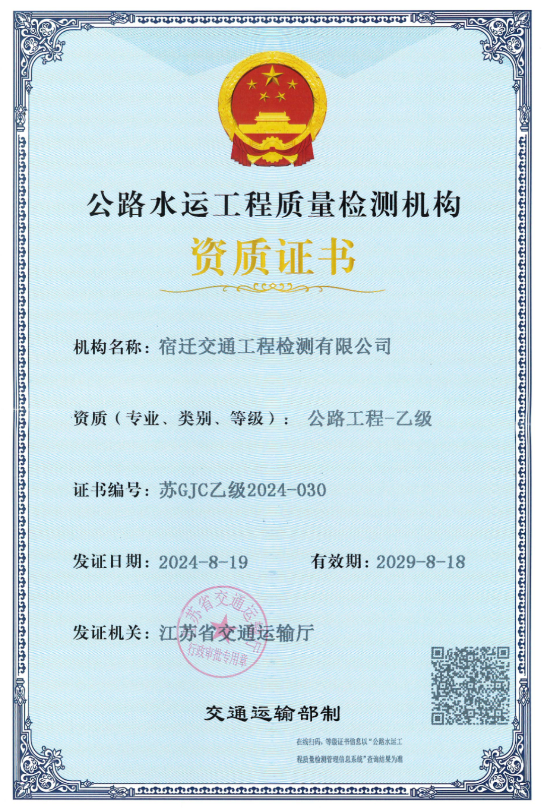 近日,宿遷交通工程檢測有限公司(以下簡稱“檢測公司”)順利通過由省交通運(yùn)輸廳組織的公路工程質(zhì)量檢測機(jī)構(gòu)乙級資質(zhì)延續(xù)審批現(xiàn)場評審,取得了新的《公路工程質(zhì)量檢測機(jī)構(gòu)乙級資質(zhì)證書》。