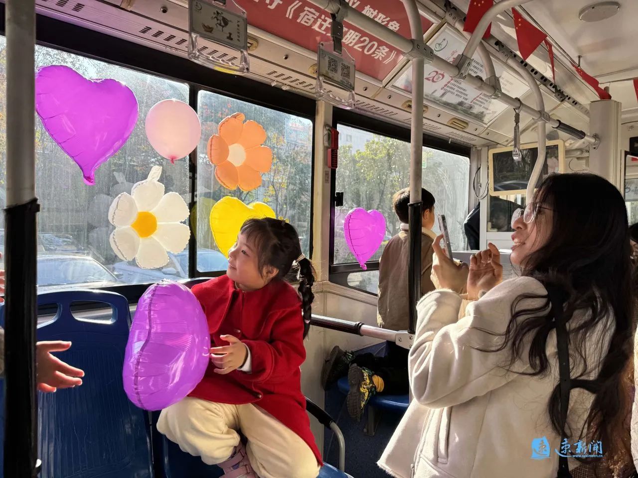 車(chē)窗被繽紛的氣球“占領(lǐng)”,車(chē)身貼著“可愛(ài)宿遷 讓愛(ài)童行”的標(biāo)語(yǔ)……11月23日下午,宿遷市人民大道群眾大廈的院子里停放了一輛兒童友好公交巴士,等待著孩子們用愛(ài)和童趣裝點(diǎn)它。