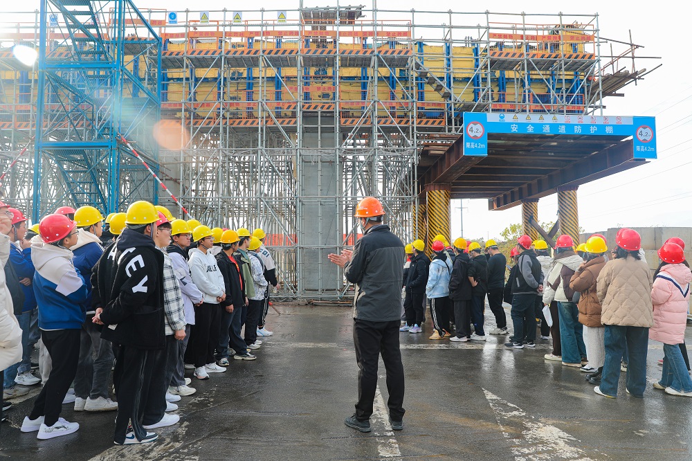在宿遷大道快速化改造工程墩柱蓋梁施工現(xiàn)場(chǎng),師生們實(shí)地觀摩墩柱和蓋梁的施工工藝;在主橋掛籃施工現(xiàn)場(chǎng),詳細(xì)了解懸臂澆筑技術(shù)的應(yīng)用與安全管理要求;在隧道施工現(xiàn)場(chǎng),師生們切身感受到地下施工的復(fù)雜性和高標(biāo)準(zhǔn)管理的必要性,通過三處施工現(xiàn)場(chǎng)的細(xì)致介紹和專業(yè)演示,使師生們對(duì)道路、橋梁及隧道建設(shè)有了直觀的了解。