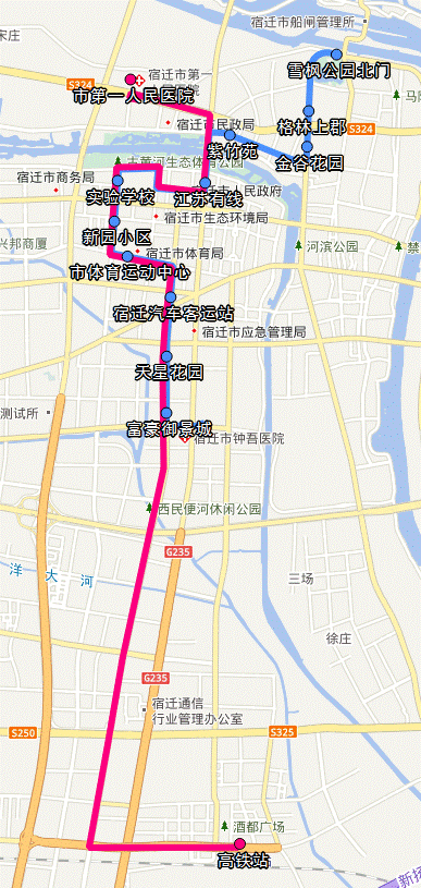 304路,將雪楓公園—宿遷·義烏國(guó)際商貿(mào)城段調(diào)整為市第一人民醫(yī)院—高鐵站,調(diào)整后路線為市第一人民醫(yī)院—頤和路—宿遷大道—發(fā)展大道—南湖路—平安大道—駱馬湖路—世紀(jì)大道—微山湖路—人民大道—上海路—高鐵站。