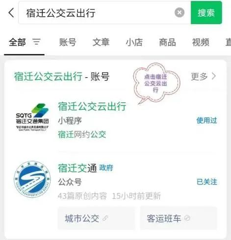 ①微信搜索“宿遷公交云出行”或手機(jī)掃公交站臺網(wǎng)約公交二維碼,進(jìn)入小程序。
