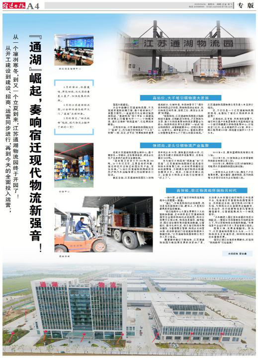 江蘇通湖物流園位于325省道南側(cè)、通湖大道西側(cè),總投資約5億元,是我市“十三五”時期“一核、五區(qū)、多節(jié)點”現(xiàn)代物流體系的重要組成部分,也是市現(xiàn)代服務業(yè)重點項目。目前,線下的園區(qū)一期項目中綜合服務中心、區(qū)域分揀中心、倉儲保管中心、城市配送中心、智能車源中心和智慧信息中心六大功能版塊已全部投入運營;線上的宿遷市公共物流信息平臺已上線運營,為促進我市“大物流”信息系統(tǒng)建設奠定了堅實基礎。