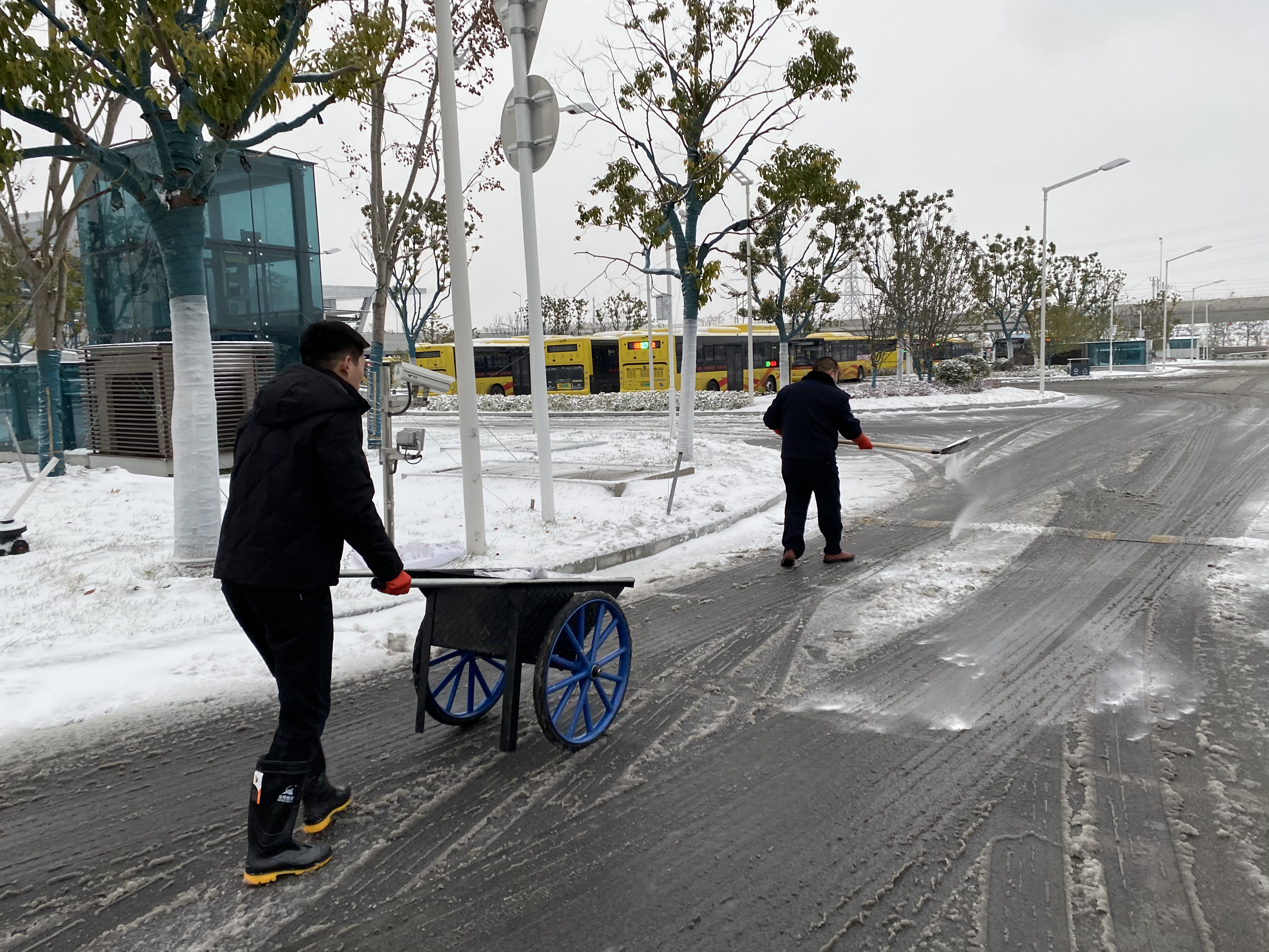 高鐵公司組織在崗職工和物業(yè)人員,利用推雪鏟、鐵鍬、掃帚等將高鐵宿遷站站前廣場積雪鏟開,對綜合客運樞紐外道路、公交停車場等易結(jié)冰的路面進行撒融雪處理,確保旅客出行安全。