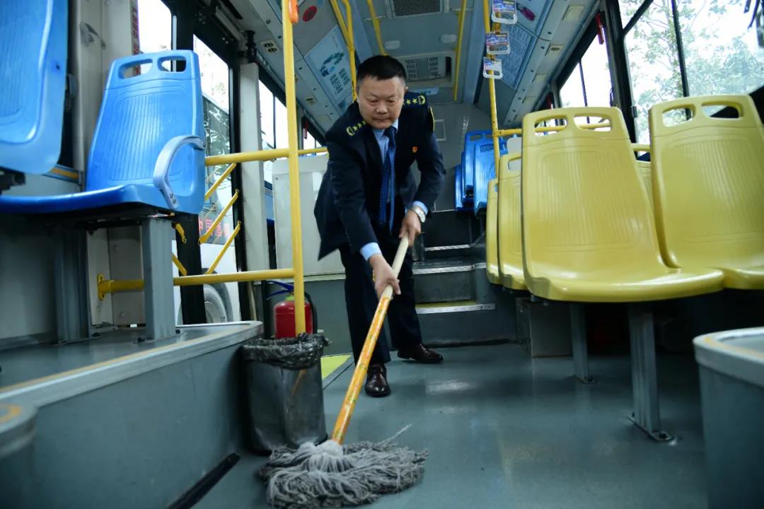 公交駕駛員利用發(fā)班間隙的休息時間打掃車輛