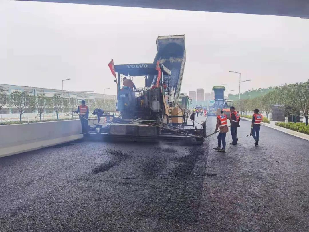 上海路(高鐵站連接線)改造二期工程正在進行瀝青面層攤鋪