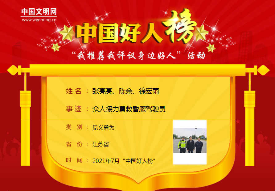 近日,中央文明辦發(fā)布2021年7月“中國(guó)好人榜”,其中,宿遷交通集團(tuán)徐宏雨入選見(jiàn)義勇為“中國(guó)好人”。