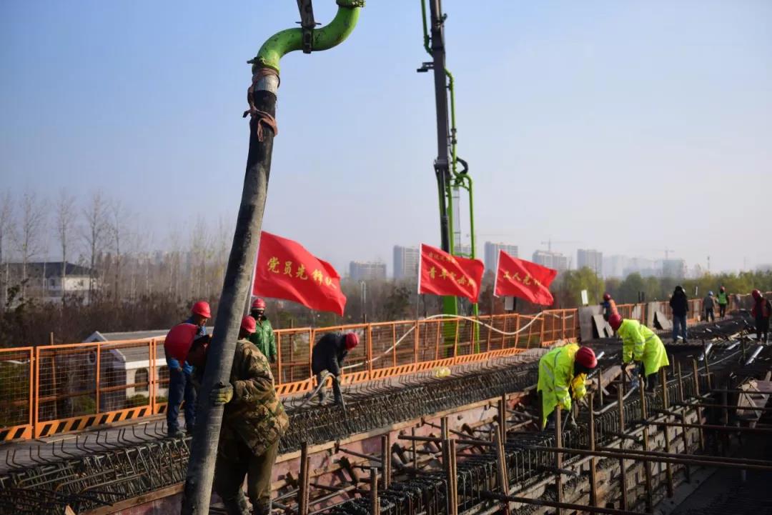 機器轟鳴,一臺臺大型吊車揮舞著“長臂”,400余名工人在各自崗位上緊張作業(yè),有的在搶抓支架搭設、預壓,有的正緊張忙碌地進行現(xiàn)澆箱梁混凝土澆筑......這是1月18日,1標段連續(xù)梁建設場景。