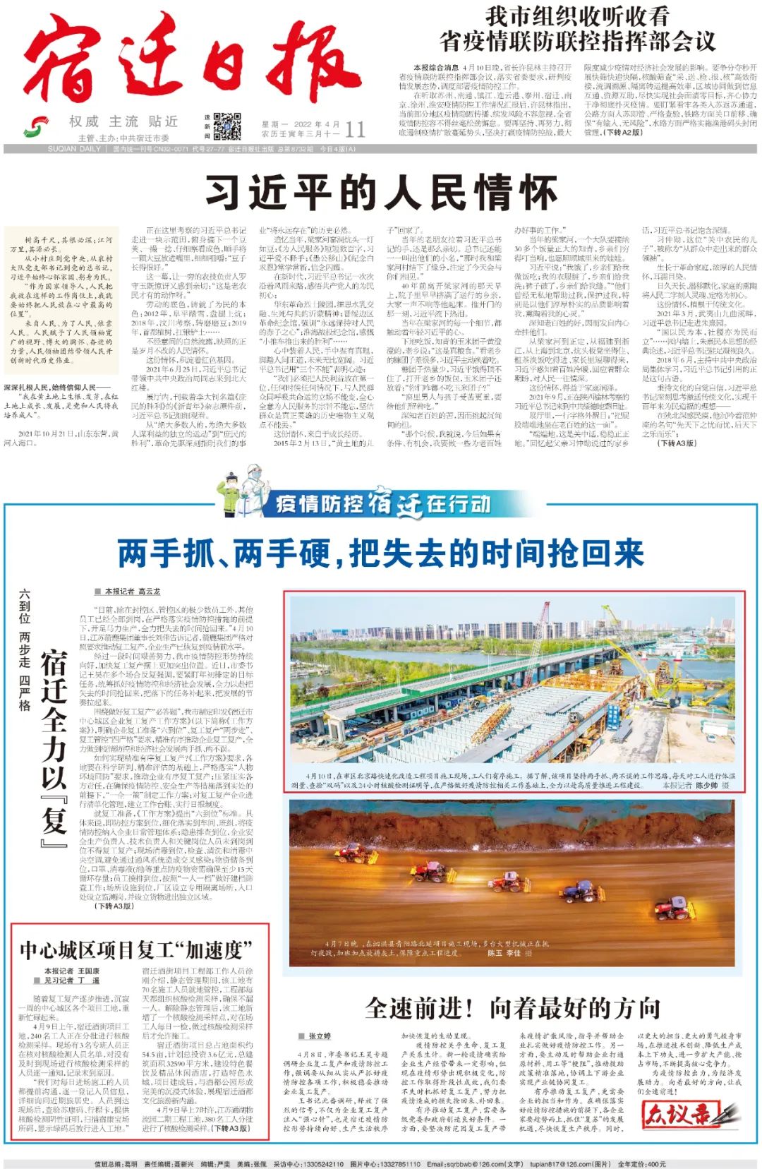 4月11日,《宿遷日報》頭版《疫情防控宿遷在行動》專欄聚焦集團重點工程項目復工復產情況。