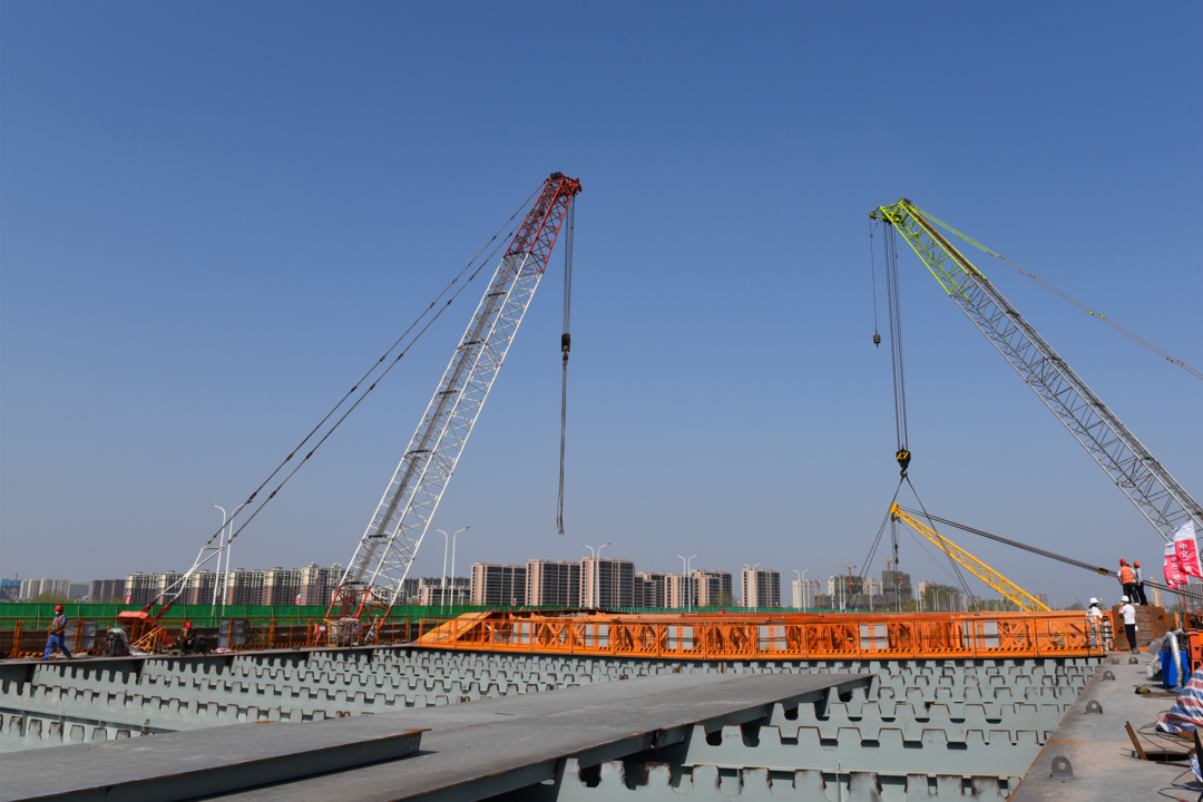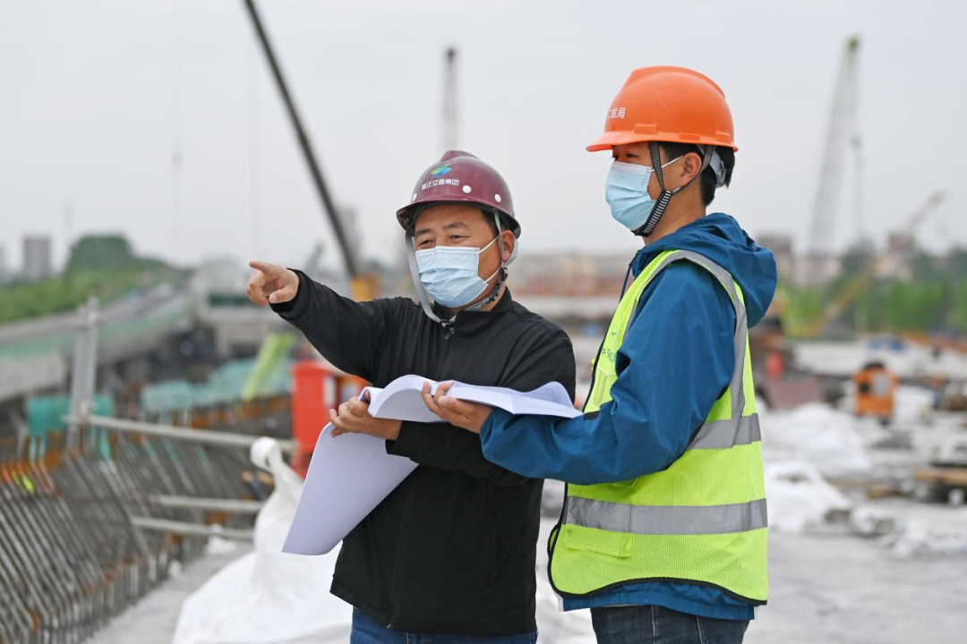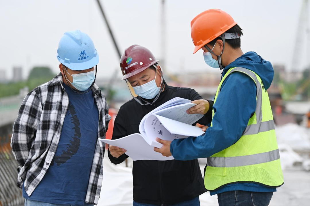 機器轟鳴、鋼架林立、塔吊聳立,5月1日,在北京路快速化改造工程跨京杭運河特大橋施工現(xiàn)場,建設工人戴著口罩不停穿梭于道路開挖、管道鋪設、橋梁架構等各個作業(yè)面,北京路快速化改造工程項目管理組組長朱寶廣與技術員認真核對圖紙,反復商討下一階段施工方案。
