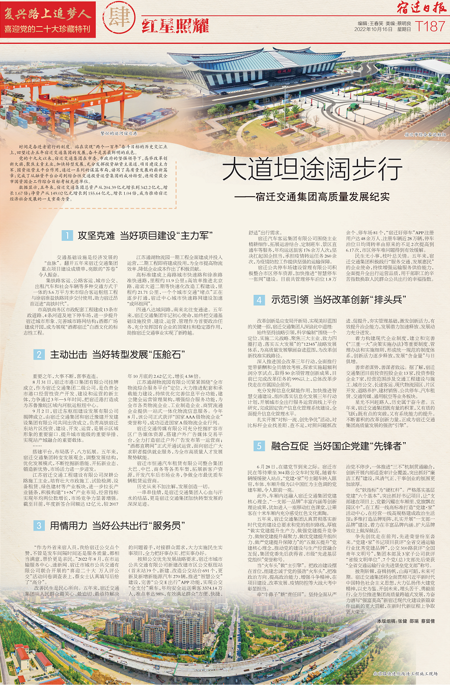 10月16日,《宿遷日報》推出喜迎黨的二十大珍藏特刊,以《大道坦途闊步行——宿遷交通集團(tuán)高質(zhì)量發(fā)展紀(jì)實(shí)》為題,專版報道了過去五年,集團(tuán)在市委、市政府的堅(jiān)強(qiáng)領(lǐng)導(dǎo)下,充分發(fā)揮投資融資主渠道、項(xiàng)目建設(shè)主力軍、國資運(yùn)營主平臺作用,通過一系列的謀篇布局,譜寫了高質(zhì)量發(fā)展的嶄新篇章。