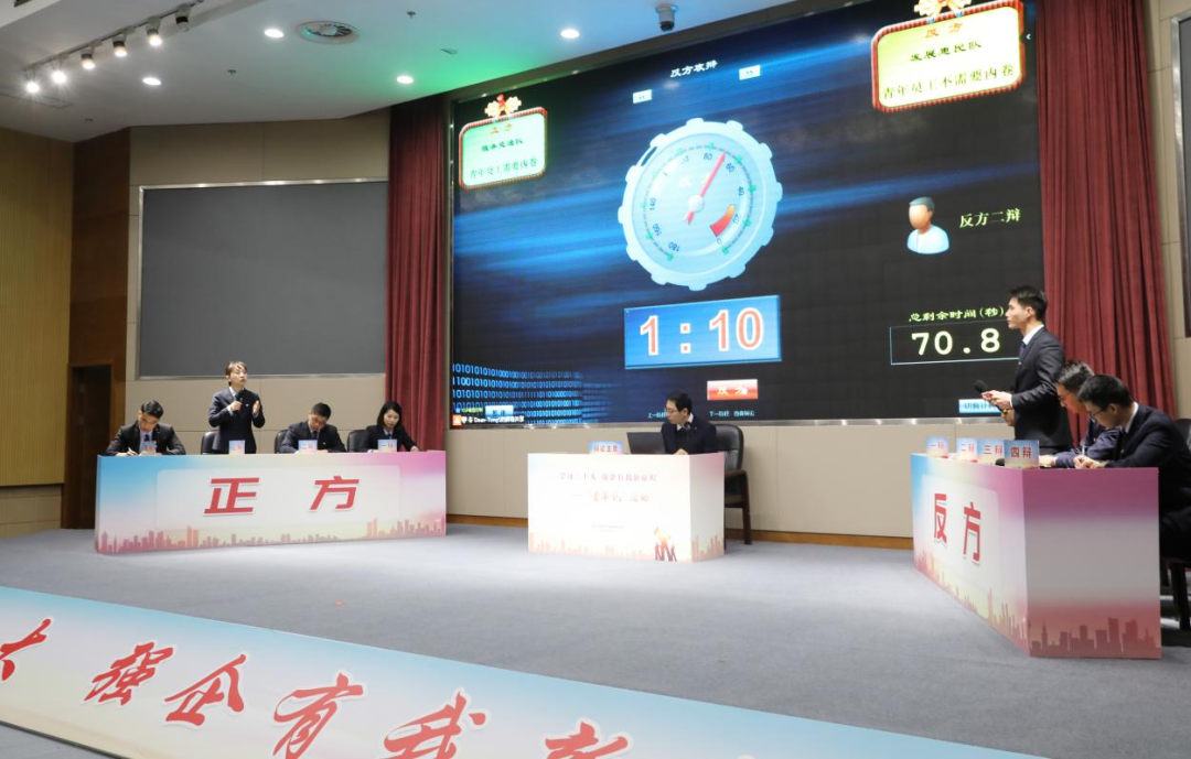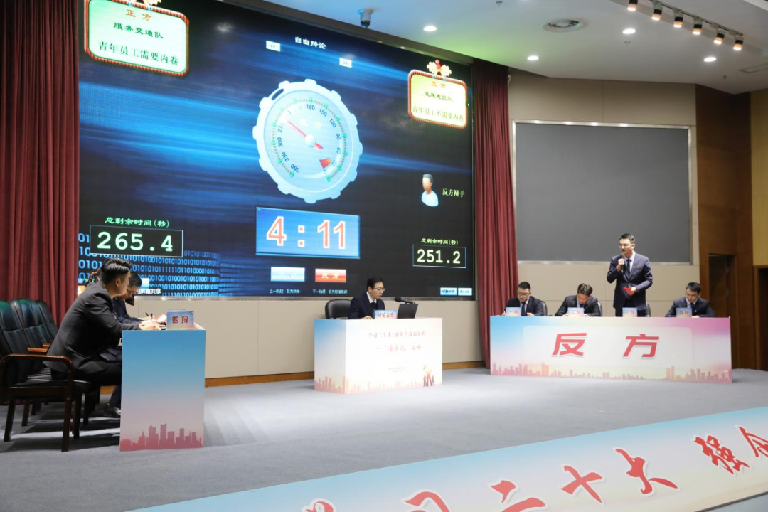 活動(dòng)中,在辯論主席介紹完比賽流程,雙方隊(duì)員自我介紹之后,比賽正式開(kāi)始。正方“服務(wù)交通隊(duì)”和反方“發(fā)展惠民隊(duì)”以“青年員工需不需要內(nèi)卷”為主題開(kāi)展了一場(chǎng)別具一格、亮點(diǎn)紛呈的辯論賽。雙方選手注意力集中,在開(kāi)篇立論、一對(duì)一攻辯、自由辯論和最終結(jié)辯環(huán)節(jié)中,集團(tuán)8位青年辯手思路清晰、觀點(diǎn)明確,旁征博引、侃侃而談,將比賽一次又一次推向高潮,現(xiàn)場(chǎng)觀眾也被帶入到緊張的氛圍之中。最后,經(jīng)過(guò)專(zhuān)家點(diǎn)評(píng)和集團(tuán)領(lǐng)導(dǎo)班子成員投票,正方一辯和反方三辯分別獲得“最佳辯手”稱(chēng)號(hào)。
