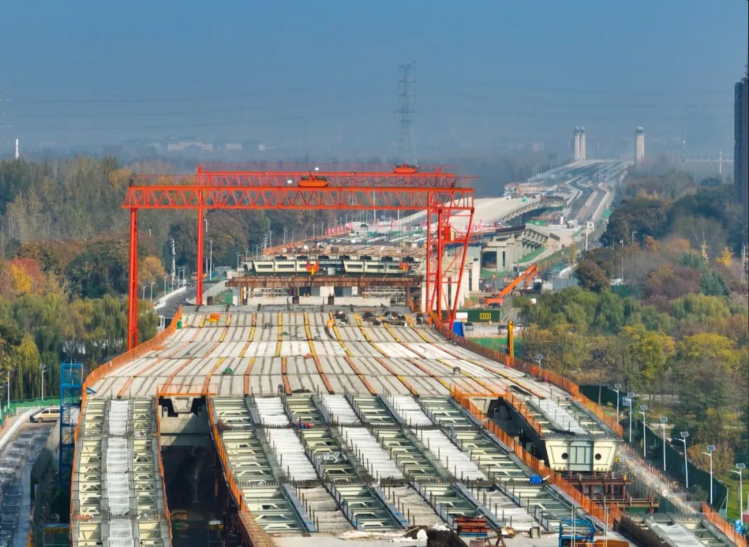 迎賓大道二期(浦東路至合歡路)快速化改造工程累計(jì)完成現(xiàn)澆蓋梁100%、箱梁架設(shè)96.8%、鋼梁吊裝92.0%、防撞護(hù)欄84.4%、橋面濕接縫85.7%、路基填方98.5%、雨污水管道96.8%、水穩(wěn)攤鋪73.1%、瀝青攤鋪62.3%、喬木64.5%、地被色塊14.2%、花灌木8.4%。
