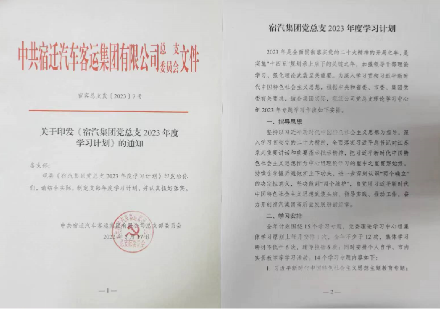 始終堅持把學習貫徹黨的二十大精神作為首要政治任務,印發(fā)《宿汽集團黨總支2023年度學習計劃》,明確黨建學習基礎架構。