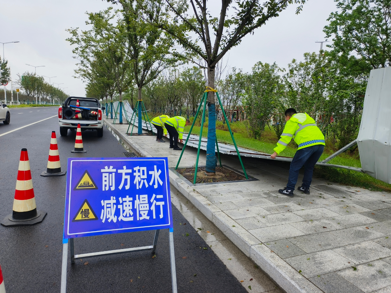 宿遷交建迅速成立應(yīng)急搶險(xiǎn)搶通小組,嚴(yán)格執(zhí)行24小時(shí)值班制和領(lǐng)導(dǎo)帶班制度,加強(qiáng)突發(fā)情況、突發(fā)事件信息采集、報(bào)送工作。工作人員深入一線加大對(duì)道路邊溝、橋梁橋下空間、排水系統(tǒng)、泵房設(shè)施等巡查力度,確保各路段排水設(shè)施和應(yīng)急供電設(shè)施正常運(yùn)行。同時(shí)對(duì)橋梁涵洞、路面低洼、地下通道等重點(diǎn)部位的安全警示標(biāo)志、標(biāo)牌、夜間信號(hào)指示燈進(jìn)行擺放加固。