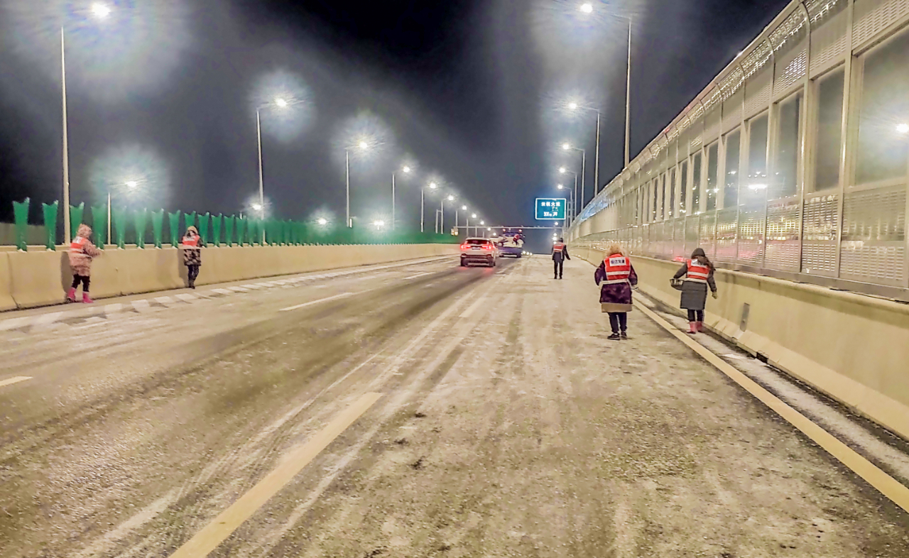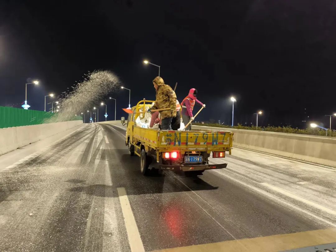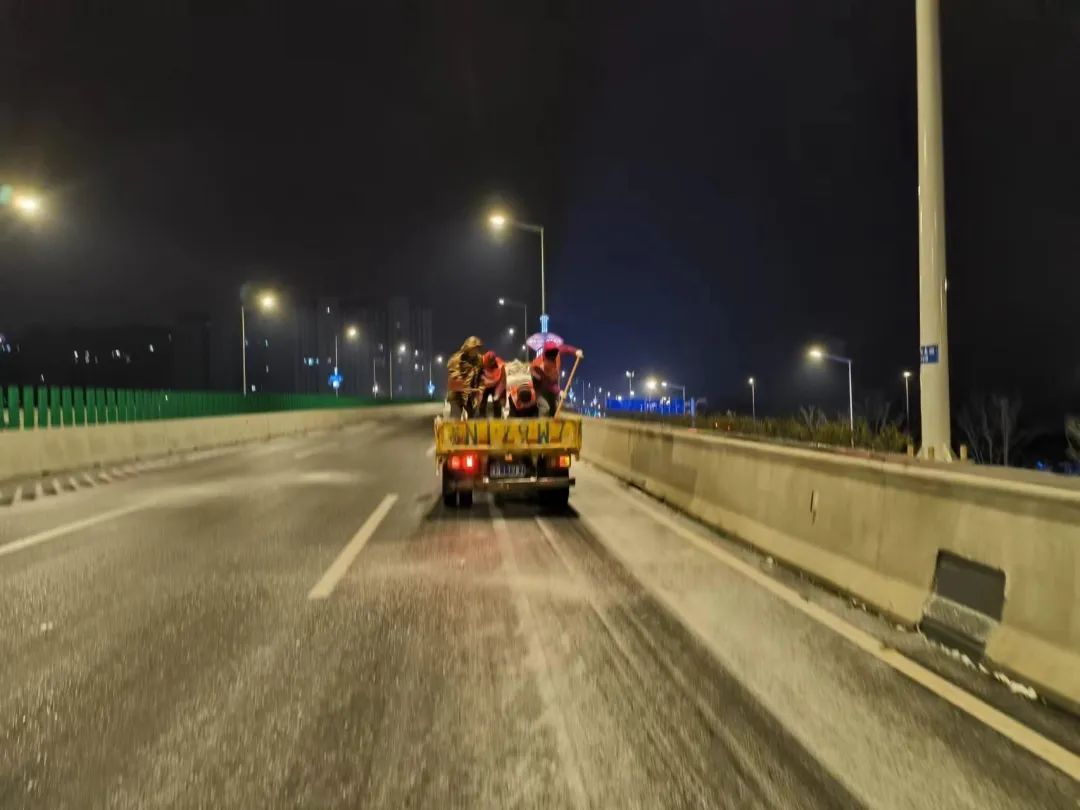 高鐵公司立即啟動應(yīng)急預(yù)案,組織養(yǎng)護單位迅速至北京路、迎賓大道二期、洋河大道、上海路等路段開展融雪除冰工作;同時,聯(lián)合市公安局鐵騎大隊互動巡查,確保道路安全暢通。宿遷交建道路養(yǎng)護黨員突擊隊第一時間上路,通過撒布融雪劑、融雪鹽和擺放防滑料,及時破除清掃結(jié)冰、積雪路段。