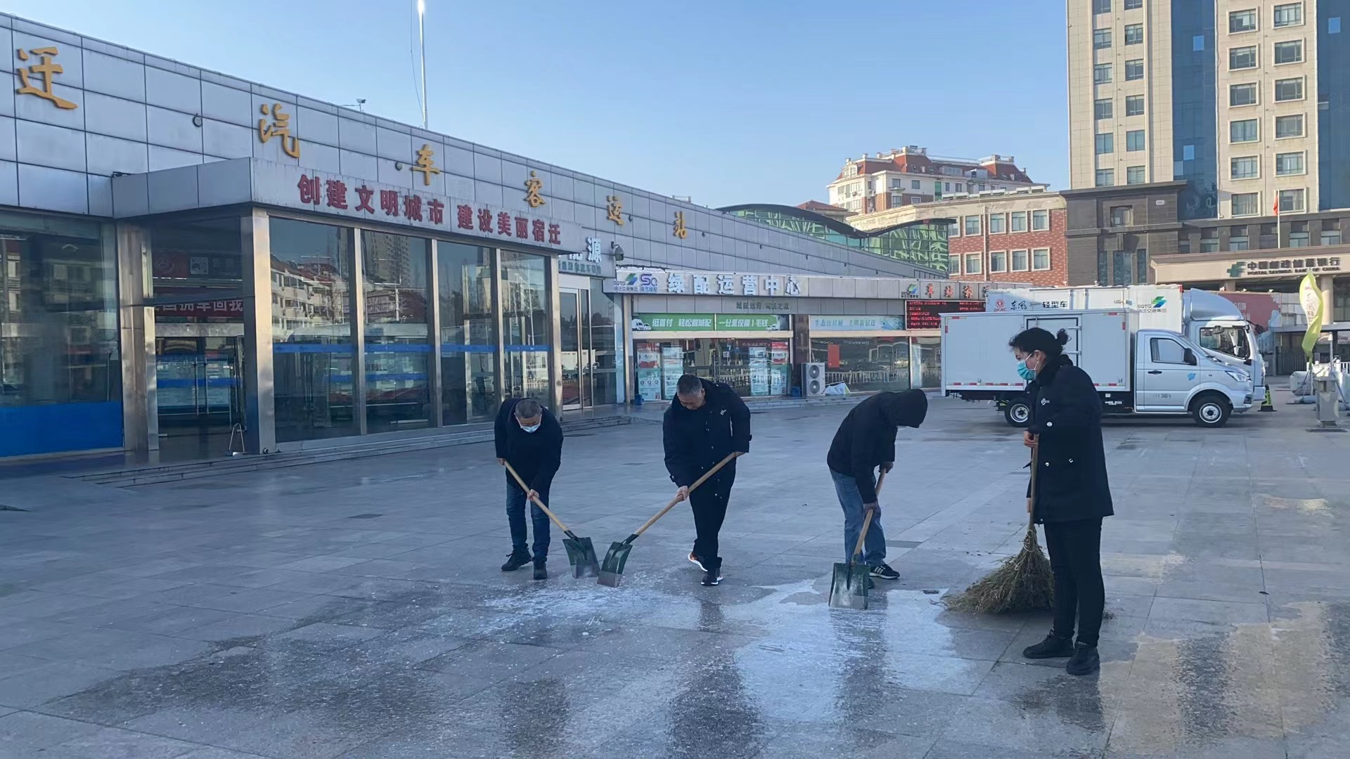 宿遷汽車客運站本著“提前預(yù)防、快速反應(yīng)、果斷處置”的原則,組織站務(wù)人員開展站前廣場除冰融雪,重點清掃廣場積雪成冰地段,防止旅客摔倒、滑倒;安排專人提前開展路面監(jiān)控,排查車輛通行困難路段,強化車輛狀態(tài)實時監(jiān)控,對駕駛員進行安全提醒,全力保障旅客出行安全。
