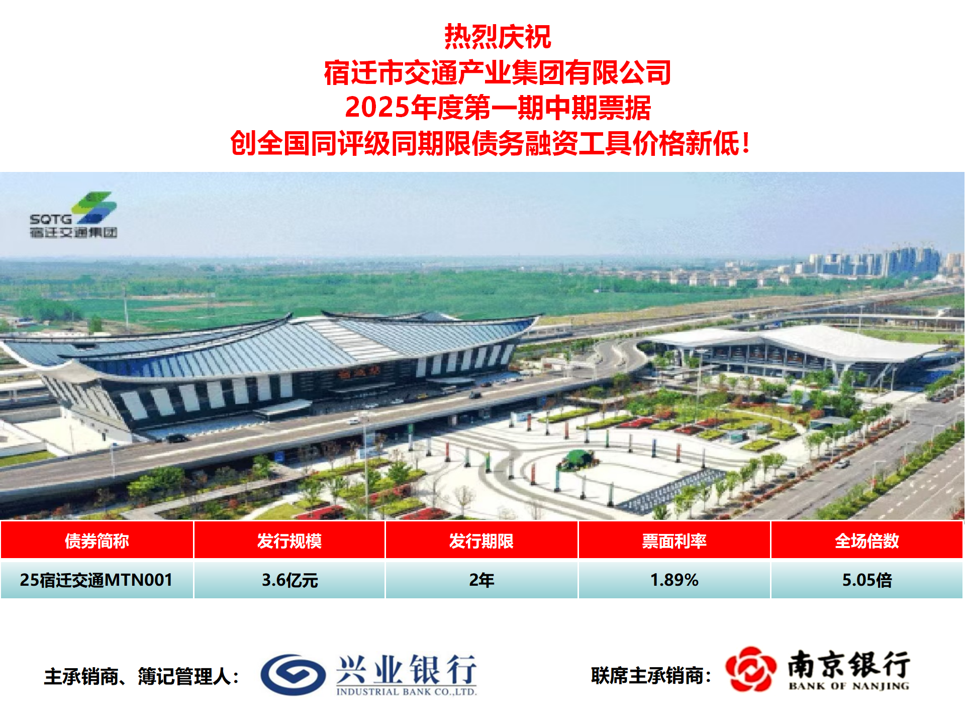 開門紅!宿遷交通集團(tuán)2025年第一期中期票據(jù)發(fā)行,利率創(chuàng)全國同評(píng)級(jí)同期限最低