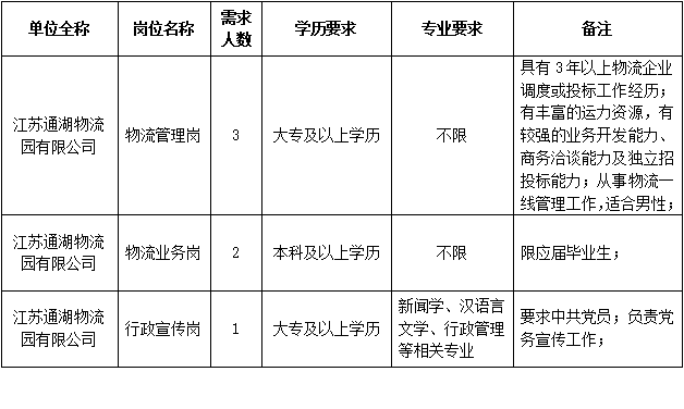 江蘇通湖物流園有限公司是一家從事物流經(jīng)營(yíng)與管理的國(guó)有企業(yè),為滿(mǎn)足業(yè)務(wù)發(fā)展需要,現(xiàn)面向社會(huì)公開(kāi)招聘一批勞務(wù)派遣制人員?,F(xiàn)將有關(guān)事項(xiàng)公布如下: