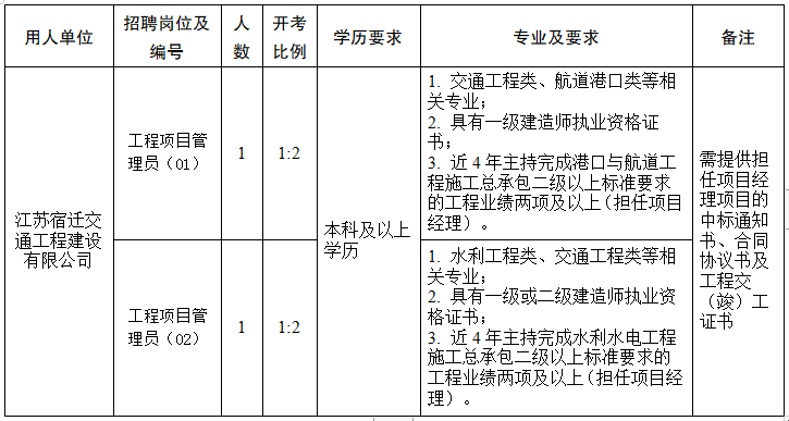 5. 具備招聘崗位要求的其它資格和條件。具體詳見《宿遷市交通產(chǎn)業(yè)集團有限公司工程技術人員招聘崗位表》。