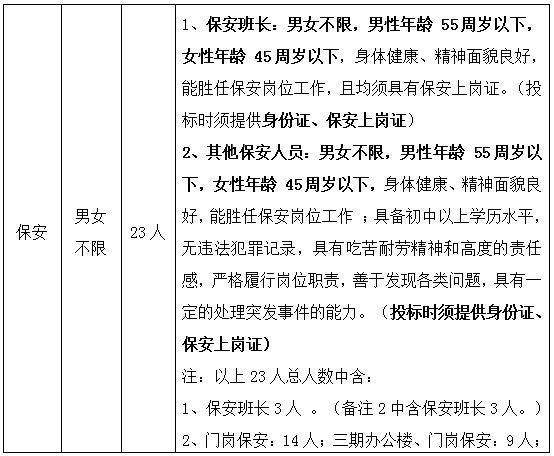 1.原采購文件 第四部分 采購需求 三、服務(wù)崗位人員配置、服務(wù)要求:保安人員要求更正為以下內(nèi)容: