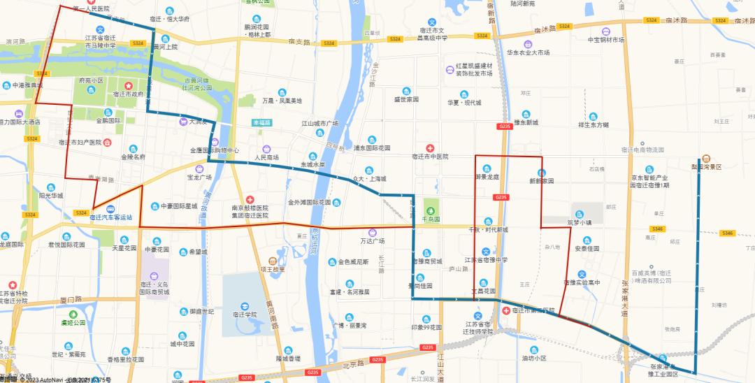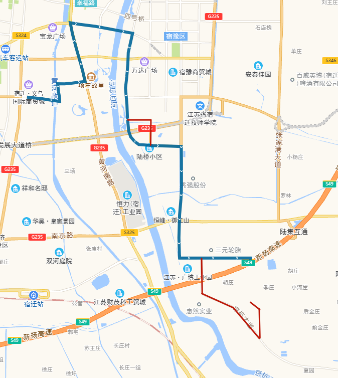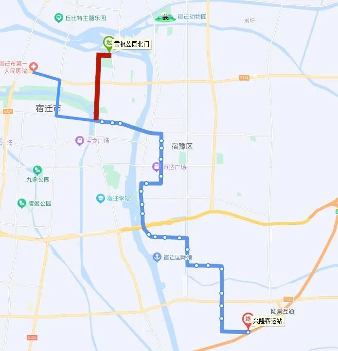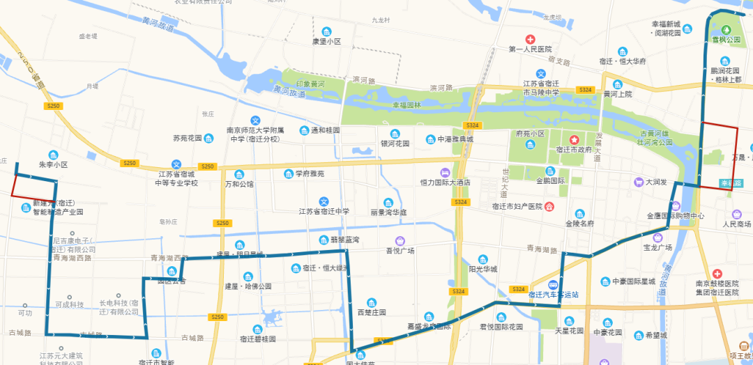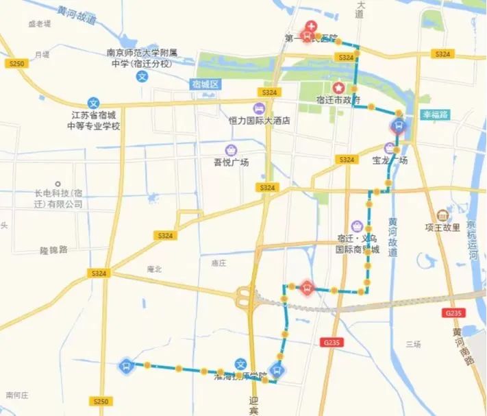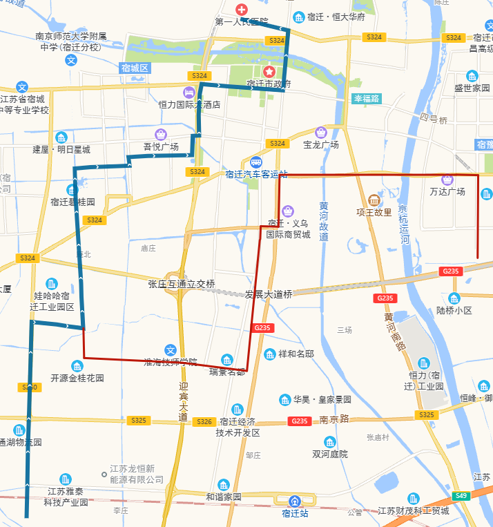 (四)318路。將現市第一人民醫(yī)院公交首末站—頤和路—濱河路—迎賓大道—洪澤湖路—世紀大道—青海湖路—平安大道—西湖路—發(fā)展大道—項王路—項王東路—珠江路—學海路—黃浦江路—洪澤湖東路—漢江路—項王東路—張家港大道—雪峰山路—楊舍路—梨園灣路段,優(yōu)化為市第一人民醫(yī)院公交首末站—宿支路—發(fā)展大道—洪澤湖路—青年路—西湖路—西湖東路—珠江路—黃山路—雪峰山路—楊舍路—梨園灣。